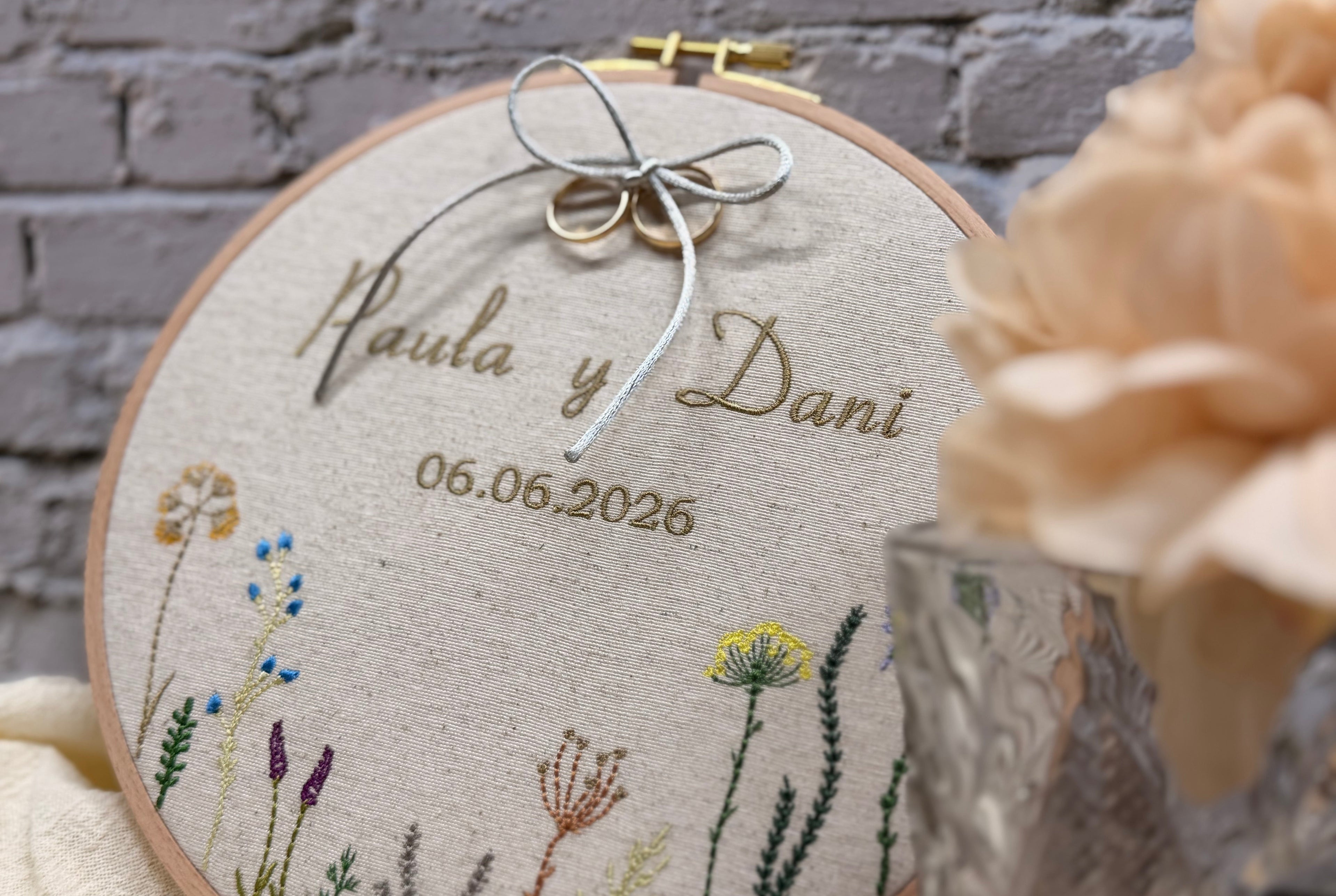 Porta alianzas en bastidor bordado personalizado Nombres y fecha
