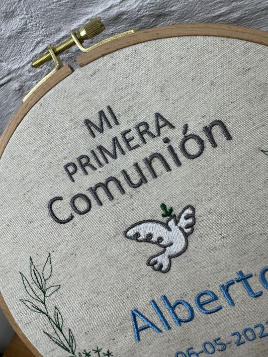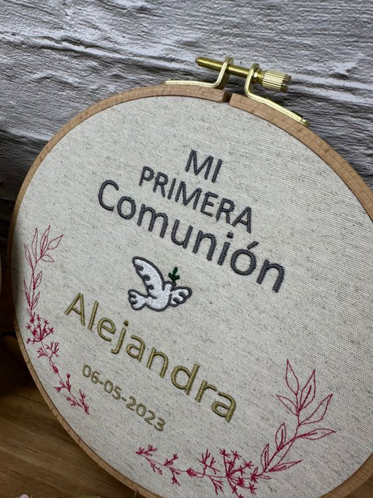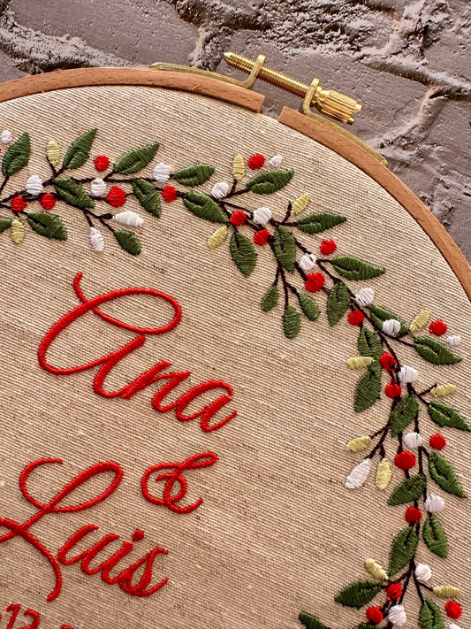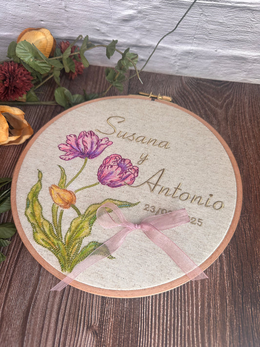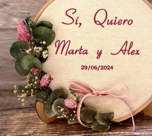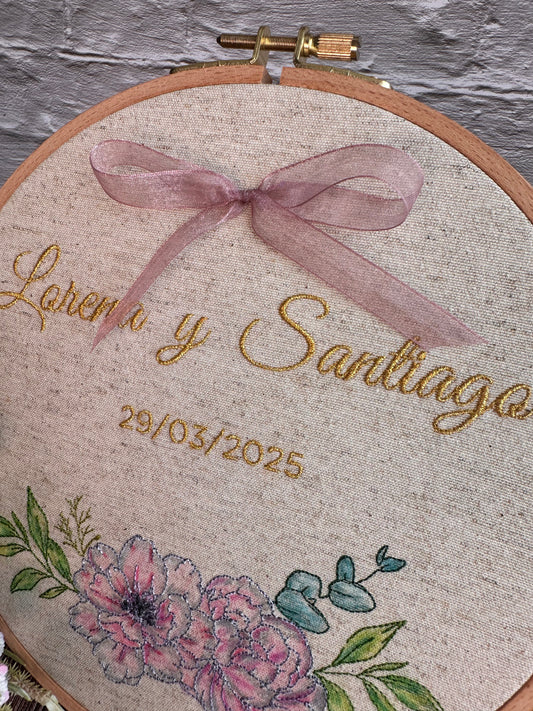 Descubre nuestros bastidores porta alianzas, diseñados y bordados a mano. Personaliza con vuestros nombres y la fecha para un recuerdo único de la ceremonia.