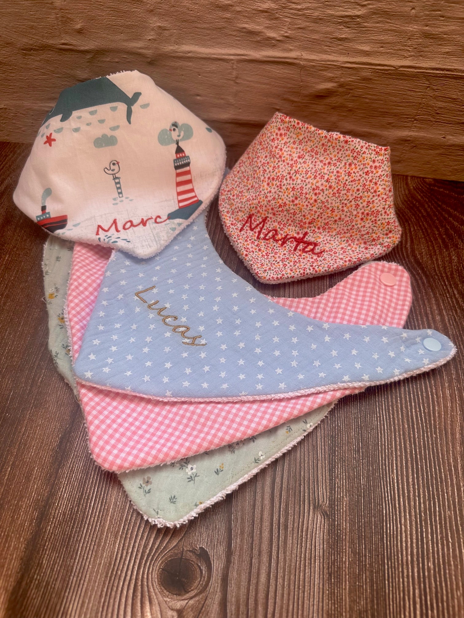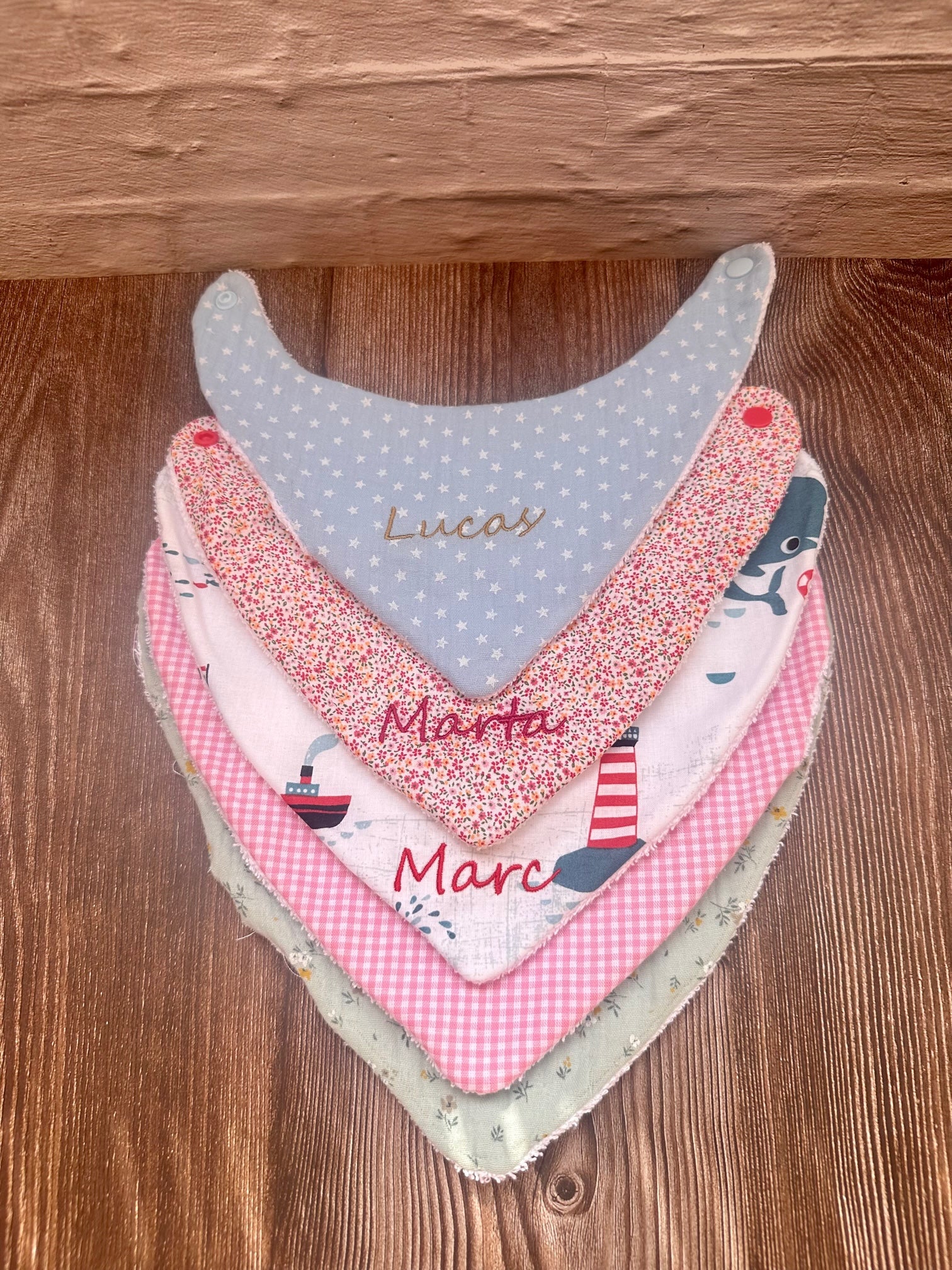 Embroidered baby bandana with name.