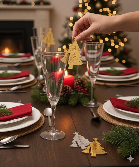 Este producto 2 en 1 no solo organiza a tus invitados con elegancia, sino que también sirve como un precioso adorno de recuerdo que podrán colgar en su propio árbol. El acabado espejo (Oro o Plata) capta la luz de las velas, creando un ambiente festivo inolvidable.